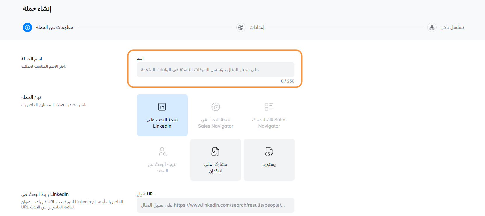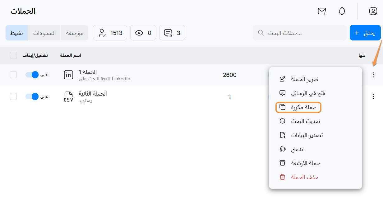 إطلاق حملة جديدة باستخدام خطوات من حملة موجودة أمر بسيط! قم بتكرار حملتك الحالية، أضف اسمًا فريدًا، واستورد العملاء المحتملين عبر رابط LinkedIn أو ملف CSV أو بحث Sales Navigator. تأكد من تحديث إعدادات العملاء المحتملين إذا لزم الأمر. استمتع بإنشاء الحملات! 🚀