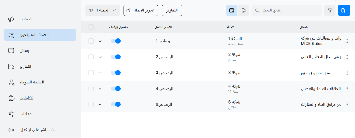 🔍 عند اتباع هذه الخطوات، ستظهر لك قائمة العملاء المحتملين للحملة المختارة التي تبدو هكذا: