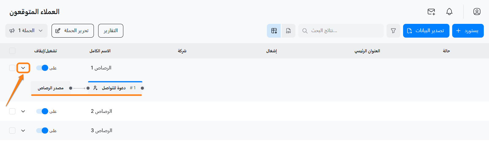 🔍 لاستكشاف رحلة العميل المحتمل بشكل أعمق، ببساطة انقر على السهم بجانب اسمه وستتمكن من رؤية التقدم الحالي للعملاء المحتملين داخل الحملة.