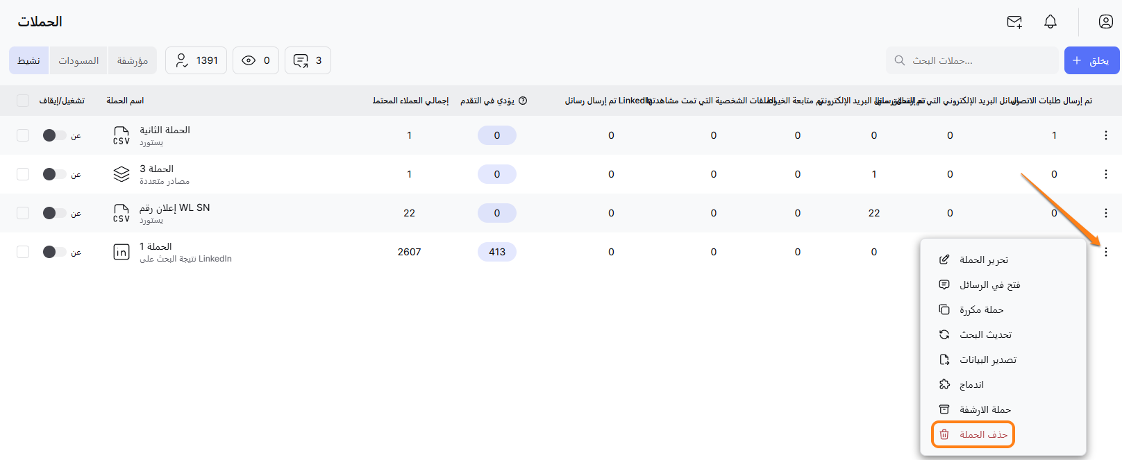 - انقر على قائمة النقاط الثلاث (🔴🔴🔴) بجانب الحملة التي اخترتها.