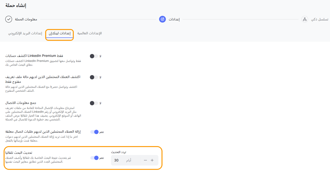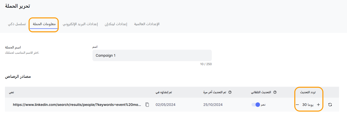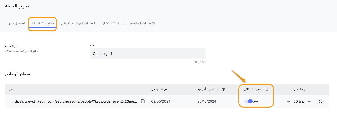 في علامة التبويب 'معلومات الحملة', سترى الخيار لتمكين تحديث البحث هنا: