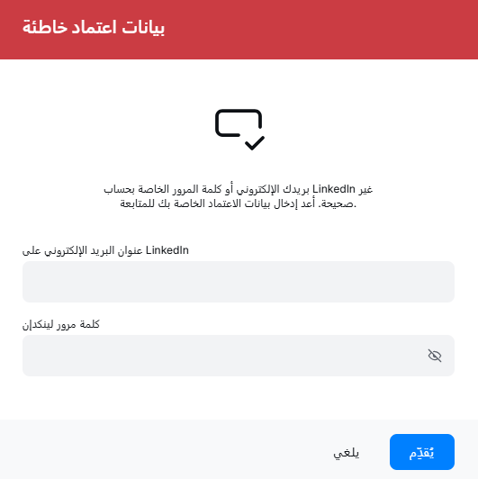 هل ترى بيانات اعتماد خاطئة؟ هذا يشير عادةً إلى عدم تطابق في بريدك الإلكتروني أو كلمة المرور. انقر على الزر الأحمر، وأعد إدخال معلوماتك بعناية، ثم أرسلها. إذا كنت في مرحلة الإعداد، قم بتحديث مدخلاتك. للحصول على مساعدة إضافية، فريق الدعم لدينا جاهز للمساعدة. نتمنى لك وصولاً سلسًا وسهلاً! 🌐✨