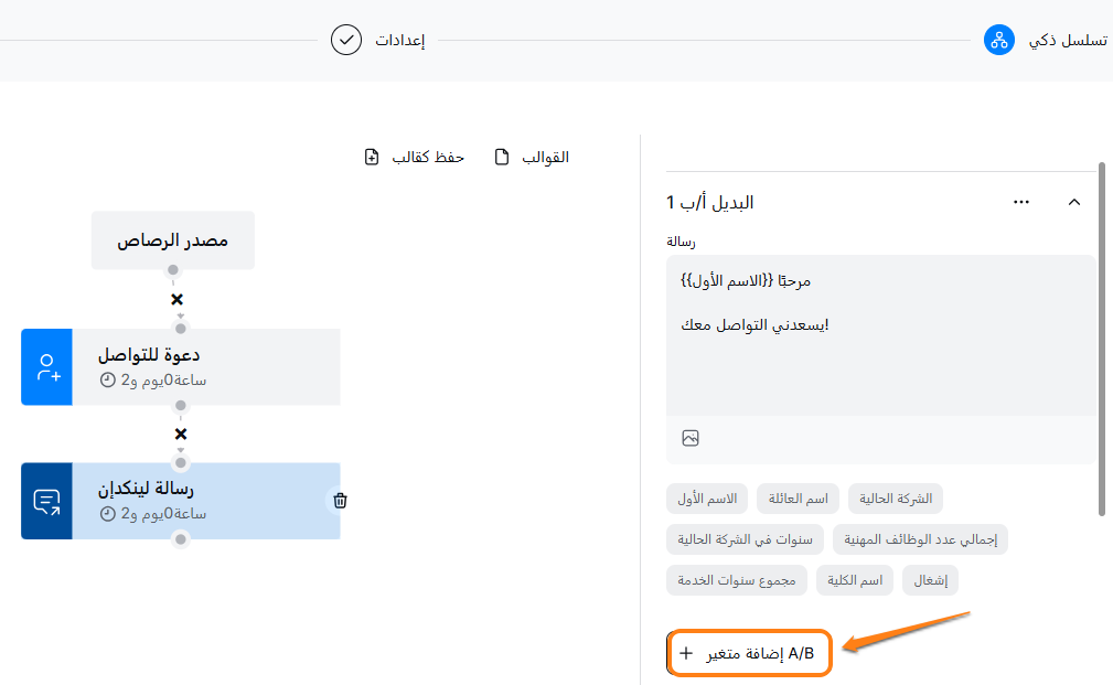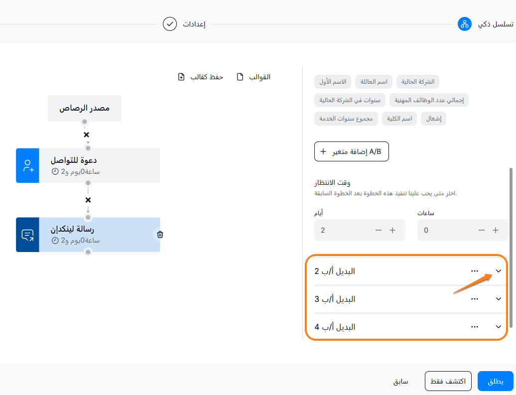 - في Leadriver، يمكنك اختبار أجزاء مختلفة من نص رسالتك، مثل رسائل LinkedIn، والبريد الإلكتروني، وInMails، والدعوات للاتصال، أو حتى توقيت الخطوات أثناء عملية إنشاء تسلسل الحملة. يمكنك إنشاء ما يصل إلى 5 متغيرات اختبار مختلفة!