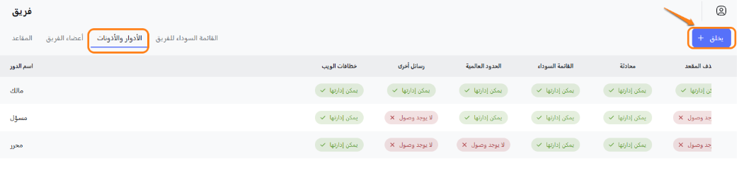 توجه إلى علامة التبويب 'الأدوار والأذونات'
