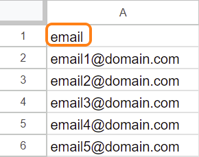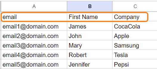 - لإرسال رسائل البريد الإلكتروني باستخدام CSV كمصدر للقيادة، تحتاج إلى عمود أساسي واحد: عمود باسم 'email' (بحروف صغيرة).