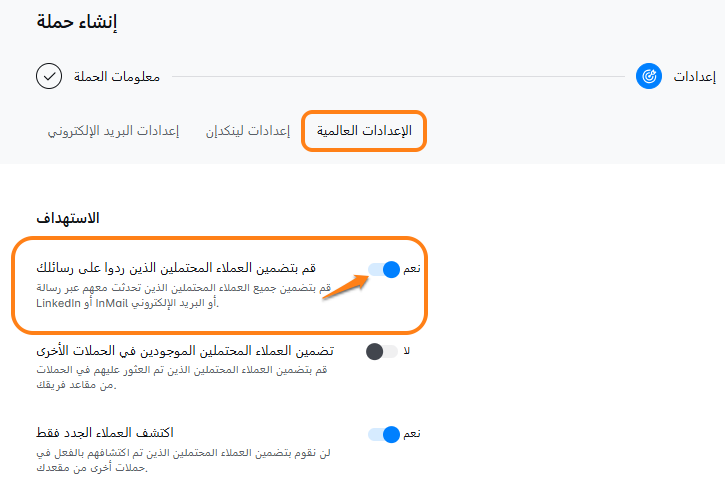 - إذا كنت ترسل رسائل بريد إلكتروني إلى عملاء تواصلت معهم سابقًا، فعّل الخيار لمتابعة سلسلة المحادثة في Campaign creation flow > Settings step > Global Settings.