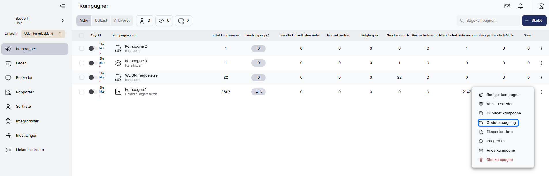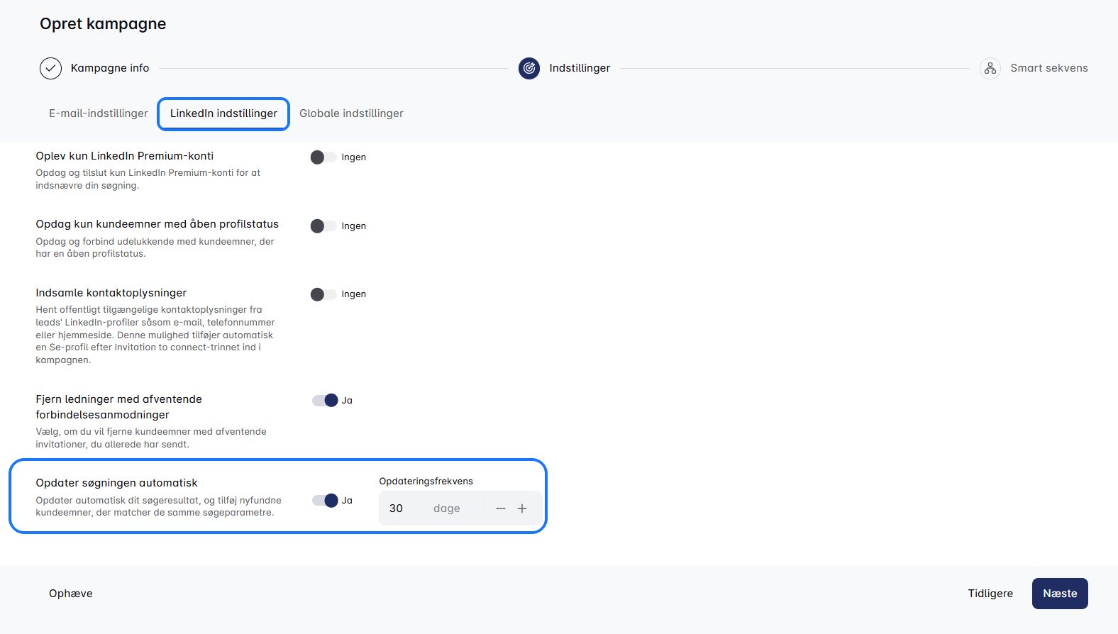 På fanen 'Kampagne info', vil du se muligheden for at aktivere Refresh search her: