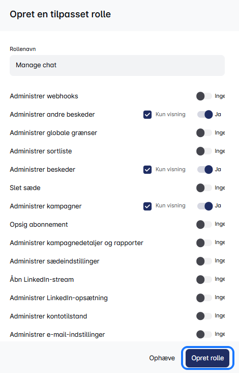 Gå til 'Roller & Tilladelser', tryk på 'Opret', og vælg tilladelser som kampagnestyring, beskedhåndtering eller sortlistning. Du kan endda indstille roller til kun at være til visning for observationsadgang. Med Tilpassede Roller kan du sikre, at hvert teammedlem har de rigtige værktøjer og adgangsniveau, hvilket forbedrer effektivitet og organisation. Nyd fleksibiliteten til at forme teamroller efter dine præcise specifikationer!✈️🌟