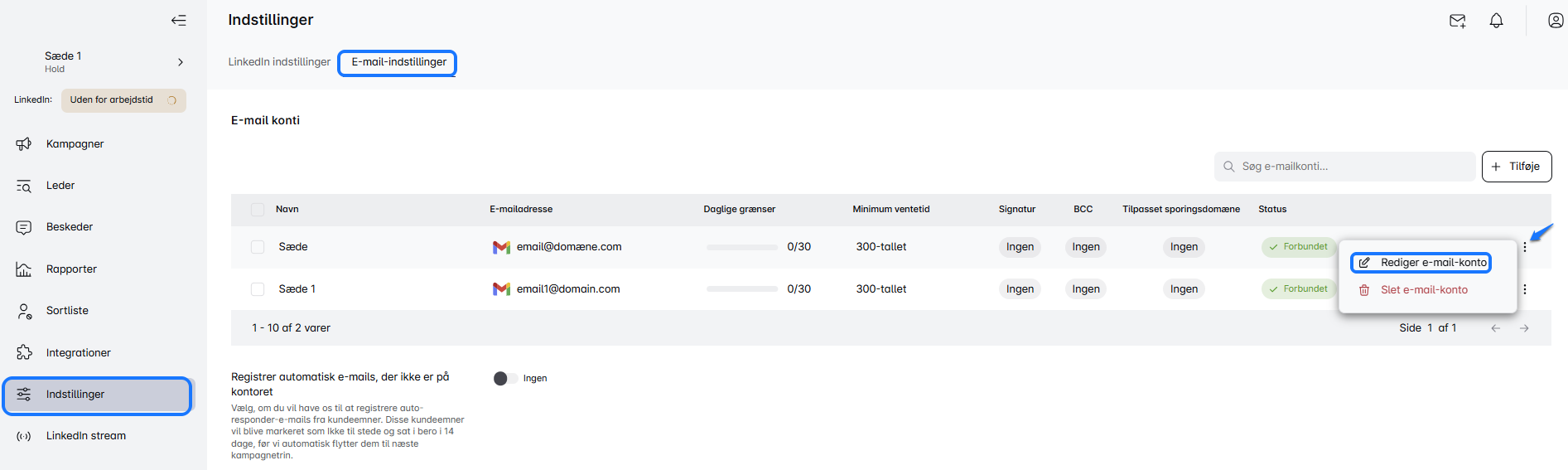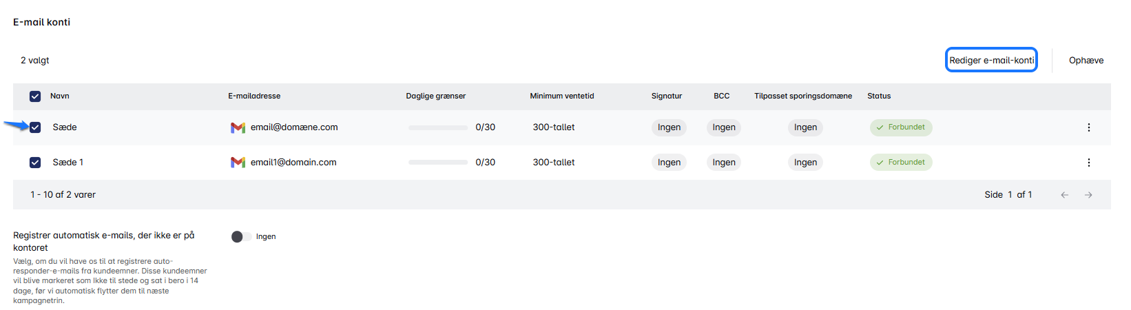 - Under fanen ‘E-mailindstillinger’ finder du en liste over dine tilsluttede e-mailadresser.