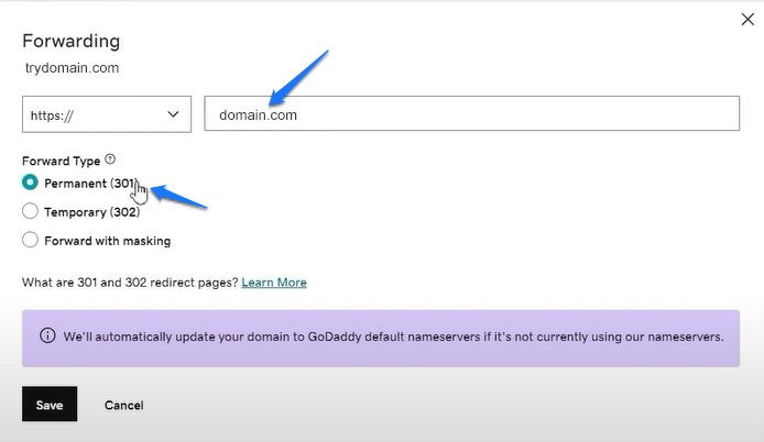 For at opsætte det, find Videresendelse, og der indtaster du din destinations-URL (hoveddomæne) og markerer den Permanente (301) videresendelsestype. Det bør typisk tage et par minutter for videresendelsen at fungere.