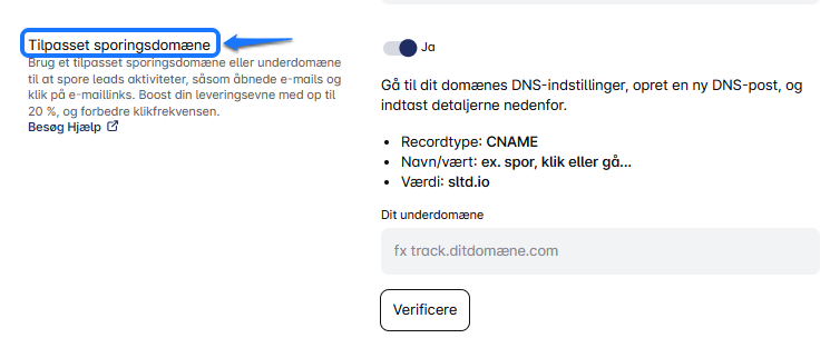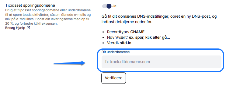 - Da vi opretter et subdomæne, skal du bruge det præfiks, du har oprettet (f.eks. track, click, go, osv.) og indsætte det i Leadriver under feltet Dit subdomæne.