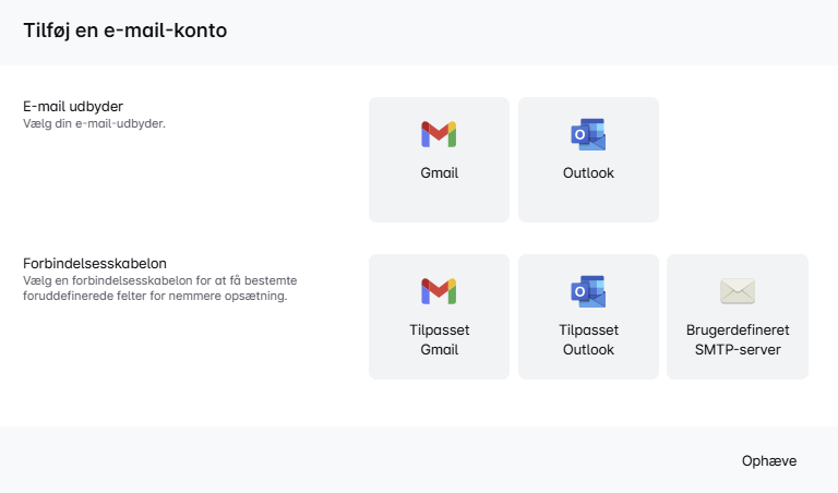 - Vælg din e-mailudbyder og den e-mailkonto, du vil tilføje. Du kan endda bruge Brugerdefinerede forbindelsesskabeloner, hvis du vil forbinde til Gmail eller Outlook via brugerdefineret SMTP eller en anden e-mailudbyder. Sørg for at give alle tilladelser til din e-mailudbyder og fortsæt. Du vil blive omdirigeret tilbage til Leadriver, og den nye e-mail vil blive vist under dine E-mailkonti.