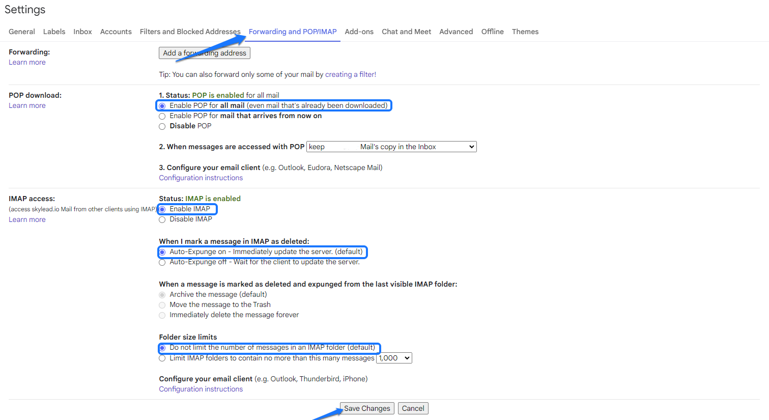 Klicken Sie anschließend auf den Tab Weiterleitung und POP/IMAP. Aktivieren Sie diese Optionen: