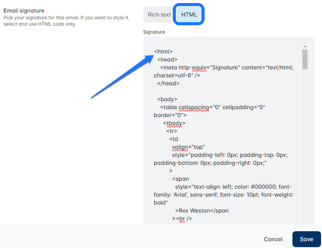 Sobald Sie die HTML-Option ausgewählt haben, fügen Sie Ihren HTML-Code mit Ihrer Signatur ein. Vergessen Sie nicht, die Vorschau zu überprüfen und Anpassungen vorzunehmen, bevor Sie sie abschließen. Wenn Sie zufrieden sind, klicken Sie auf 'Speichern', um sie zu speichern!