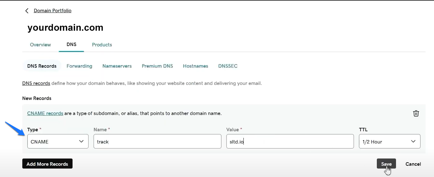 - Dieses Mal finden Sie im Dropdown-Menü unter Eintragstyp CNAME und fügen die in den benutzerdefinierten Tracking-Domain-Einstellungen des Leadriver bereitgestellten Details ein.
