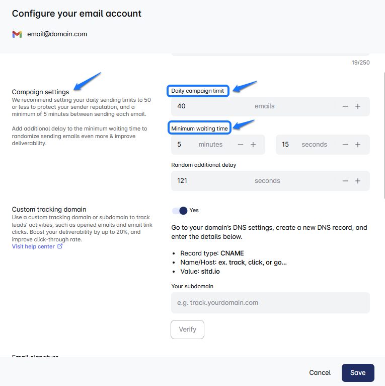 So funktioniert es: Wenn Sie eine E-Mail mit Links senden (wie bei kaltem Outreach), verwendet das Tracking dieser Links oft eine generische Domain Ihrer E-Mail-Plattform, die sowohl für Empfänger als auch E-Mail-Anbieter spammy aussehen kann. Durch das Einrichten einer benutzerdefinierten Tracking-Domain ersetzen Sie diesen generischen Link durch einen, der Ihre Domain verwendet. Dies hält alles gebrandet und vertrauenswürdig, was bedeutet, dass Ihre E-Mails bessere Chancen haben, im Posteingang zu landen.