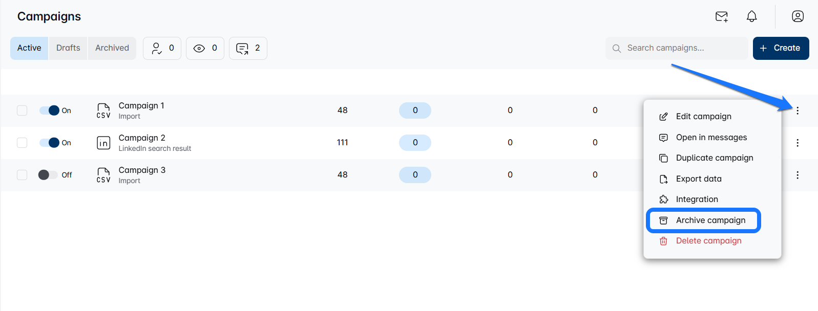 Keep your Leadriver dashboard clutter-free by archiving past campaigns! 🗂️ Archive any campaign via the three dots menu, then switch to Archived Campaigns to access and restore as needed. This feature helps you stay organized while keeping campaigns available for future reference. Ready for a tidier workspace? Happy organizing! 🚀🌟