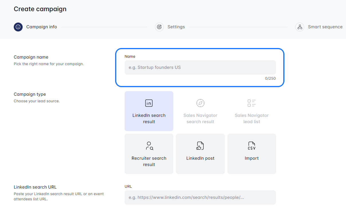 ¡Lanzar una nueva campaña utilizando pasos de una existente es simple! Duplica tu campaña actual, añade un nombre único e importa prospectos a través de URL de LinkedIn, CSV o búsqueda en Sales Navigator. Asegúrate de actualizar la configuración de prospectos si es necesario. ¡Disfruta creando campañas! 🚀