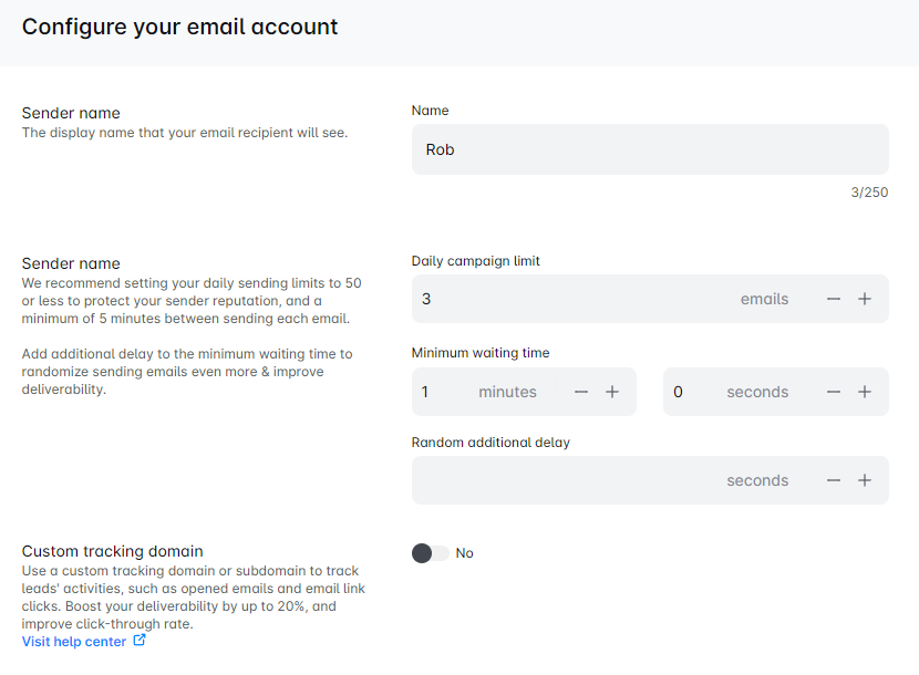 Aquí, puedes cambiar el nombre del remitente, ajustar la configuración de la campaña, establecer un dominio de seguimiento personalizado, actualizar tu firma e incluso agregar destinatarios en CCO. 🖊️