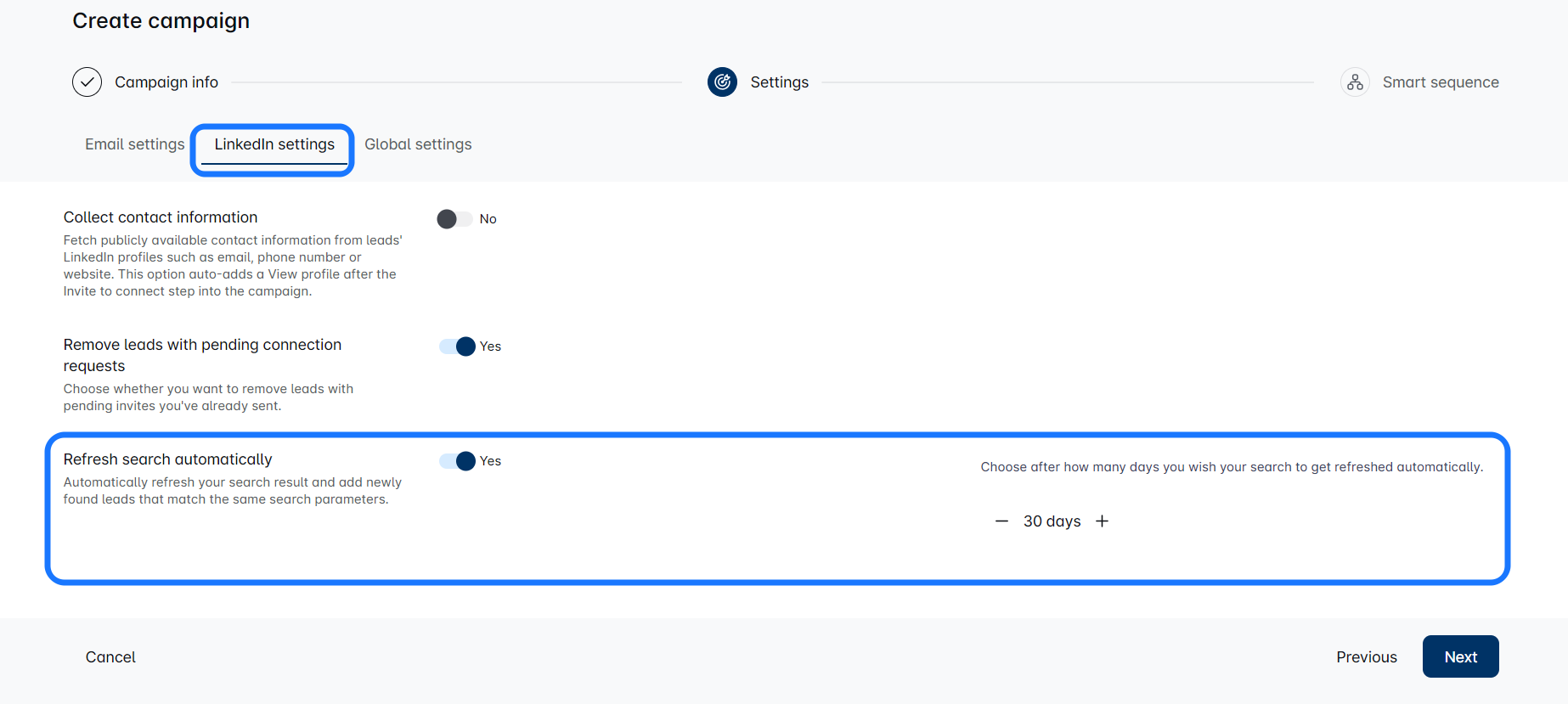 En la pestaña 'Información de la campaña', verás la opción para habilitar la actualización de búsqueda aquí: