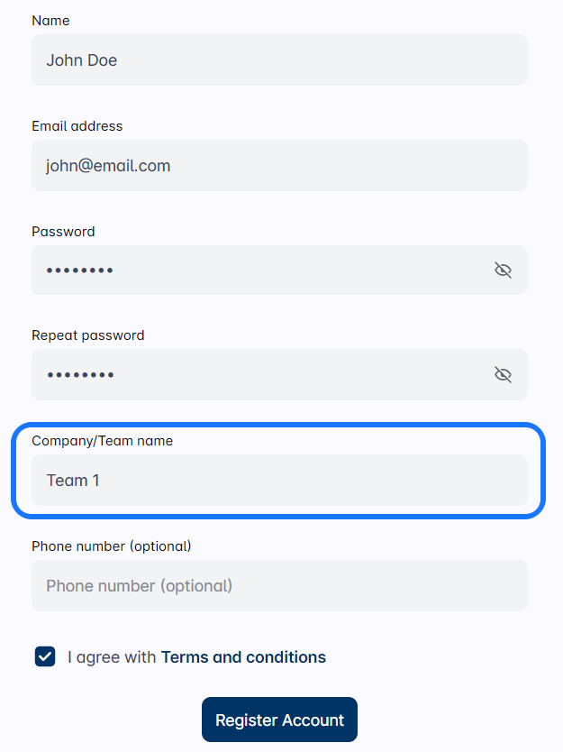 Cuando te registras por primera vez en la plataforma, tu equipo inicial se crea automáticamente. ¿Su nombre? Es simplemente el nombre de la empresa que ingresaste durante el registro. Fácil, ¿verdad? 🎯