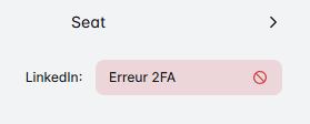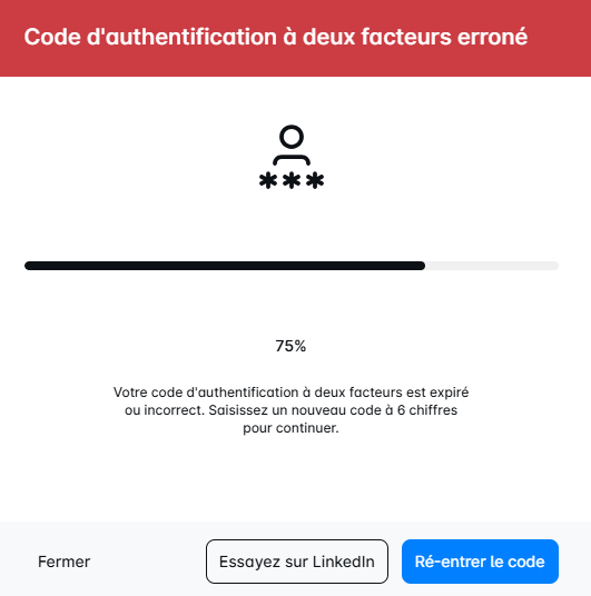 Parfois, lors de l'intégration, vous pourriez voir un statut 'Erreur d'authentification à deux facteurs'. Cela se produit généralement si le code que vous avez saisi est invalide, soit parce qu'il a expiré (après 1 minute) soit parce qu'il n'a pas été saisi correctement.