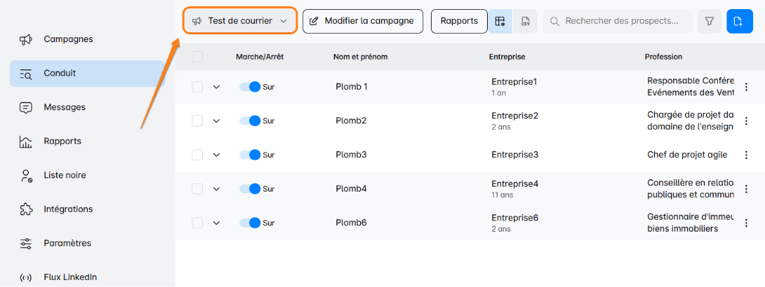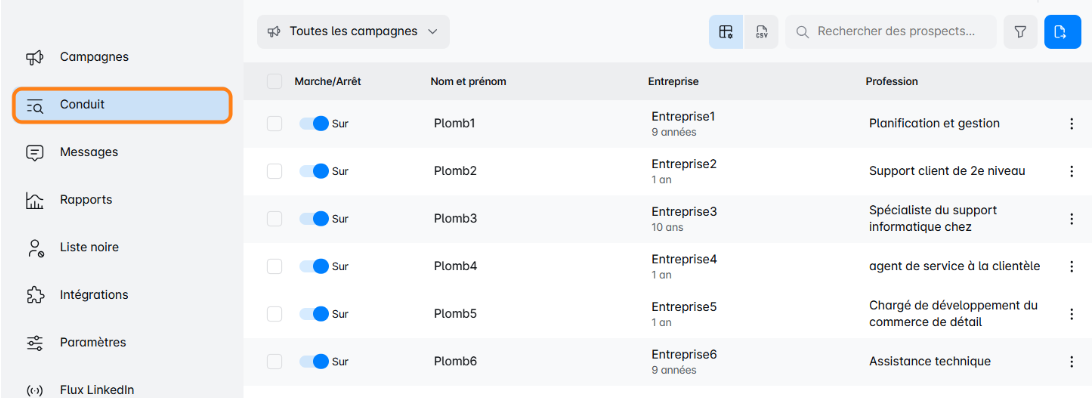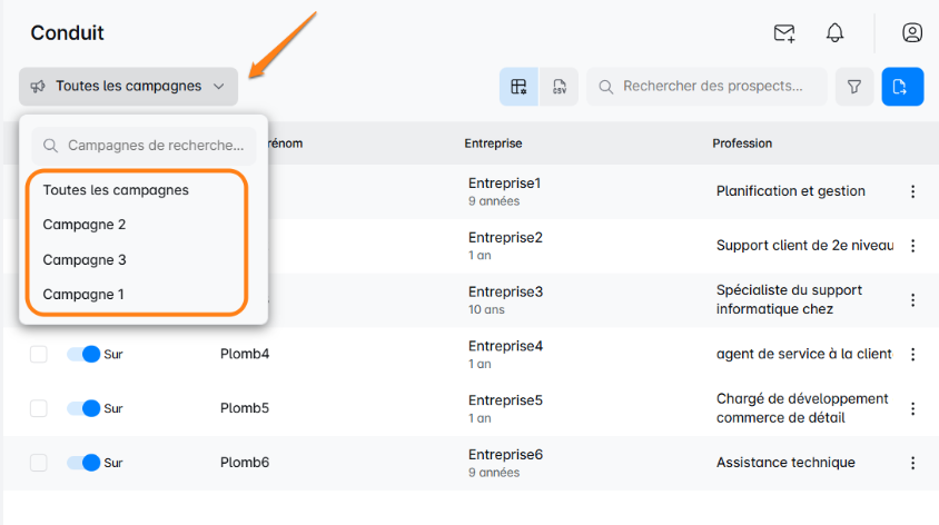 Vous avez une campagne spécifique en tête ? Sélectionnez-la pour voir les prospects associés à cette campagne. C'est comme filtrer pour voir ce qui est le plus pertinent pour vous !
