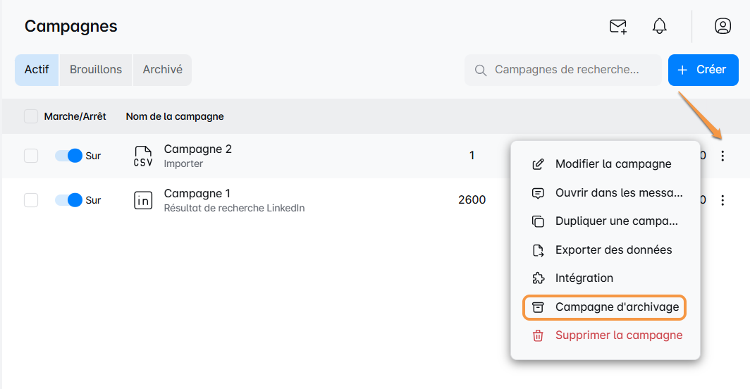 Dans le menu qui s'affiche, choisissez l'option "Archiver la campagne".