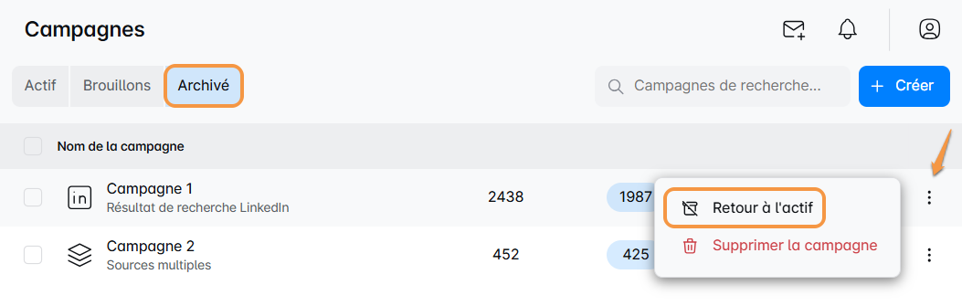 Gardez votre tableau de bord Leadriver sans encombrement en archivant les campagnes passĂ©es ! đïž Archivez n'importe quelle campagne via le menu Ă trois points, puis passez Ă Campagnes archivĂ©es pour y accĂ©der et les restaurer si nĂ©cessaire. Cette fonctionnalitĂ© vous aide Ă rester organisĂ© tout en gardant les campagnes disponibles pour rĂ©fĂ©rence future. PrĂȘt pour un espace de travail plus ordonnĂ© ? Bon rangement ! đđ