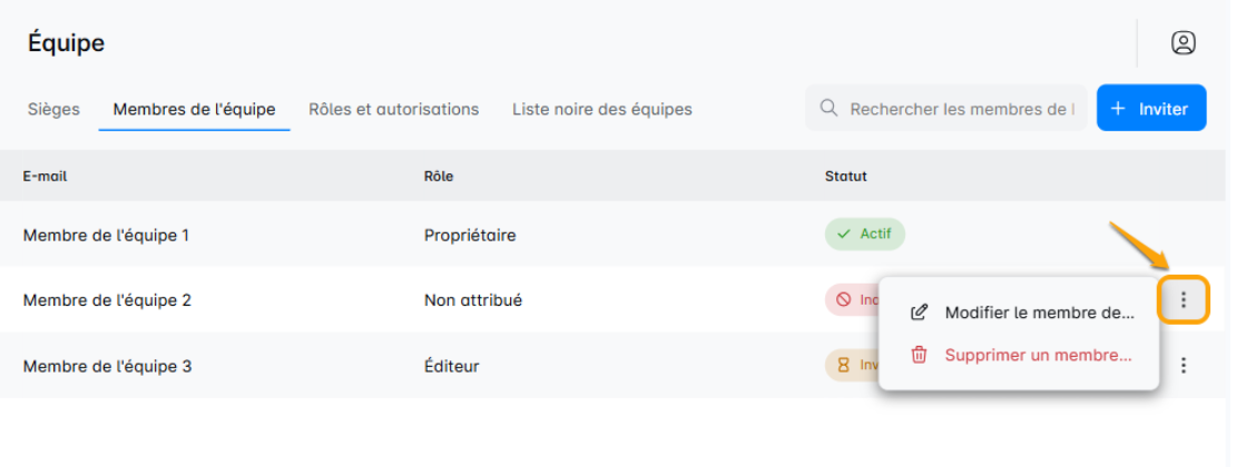Besoin de modifier le rôle de quelqu'un ? Cliquez simplement sur le bouton 'Modifier le membre de l'équipe' pour apporter des changements. Pour une aide plus détaillée, consultez nos articles sur ce sujet !