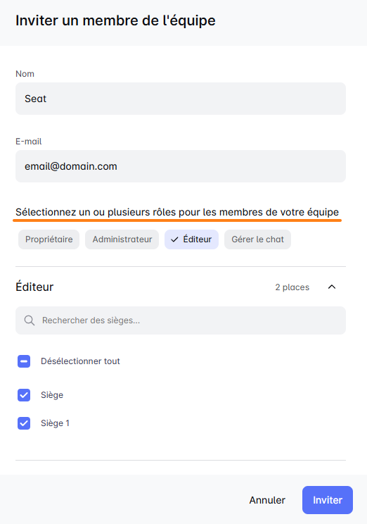 Dans la nouvelle fenêtre, vous choisirez le rôle et attribuerez des places pour votre nouveau membre. C'est comme choisir un nouvel acteur pour votre pièce, en vous assurant que chacun a le rôle parfait pour le succès de votre équipe ! 🎭