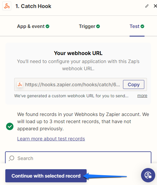 - Cliquez sur “Continue with selected record” dans Zapier pour passer à l'étape suivante.
