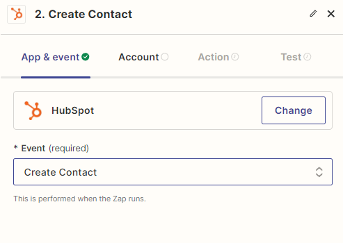 - Choisissez “Créer un contact” dans HubSpot comme action.
