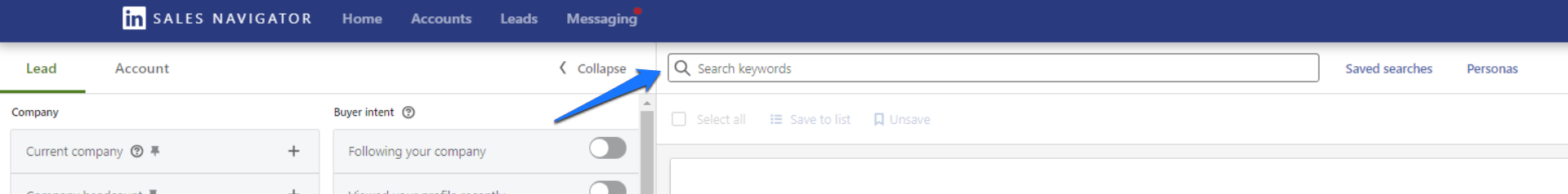 - Cliquez sur la barre "Recherche" en haut de votre tableau de bord Sales Navigator.
