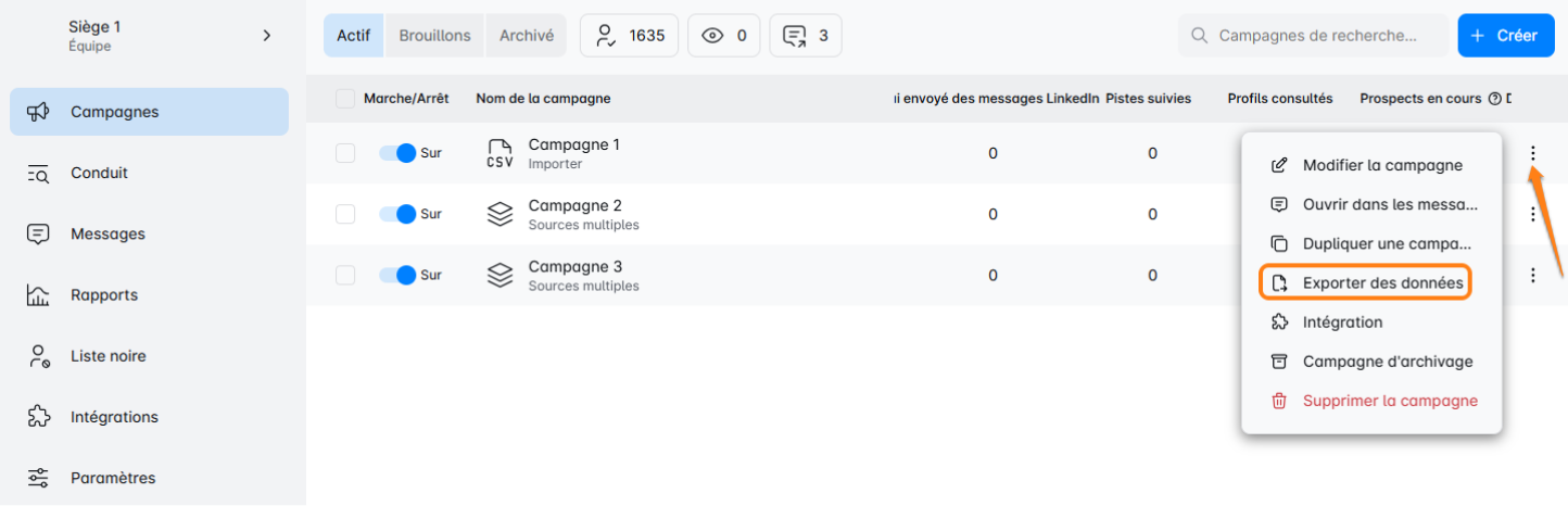 - Vous pouvez exporter des données d'une campagne sélectionnée. C'est parfait lorsque vous souhaitez obtenir des informations d'une campagne spécifique ! Cliquez simplement sur le bouton des trois points à côté de la campagne souhaitée, puis choisissez l'option "Exporter les données" pour exporter le fichier.