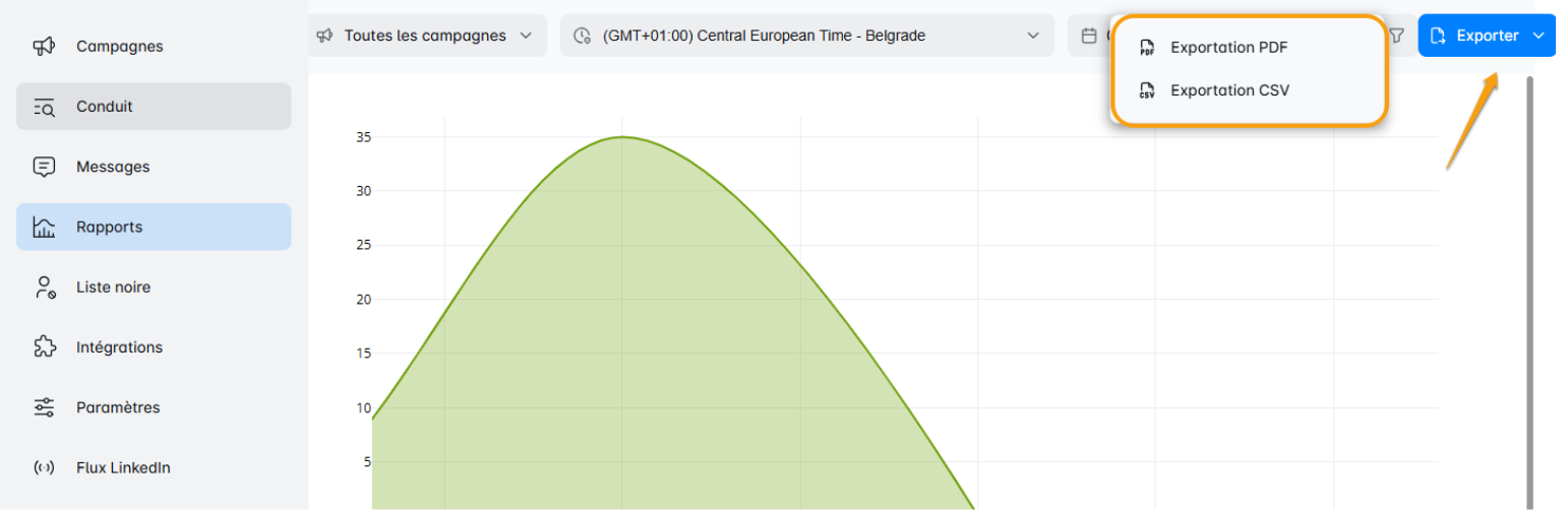 - Cette option est accessible depuis la section Leads dans le menu de gauche. Elle vous permet d'exporter les données de toutes vos campagnes en une seule fois.