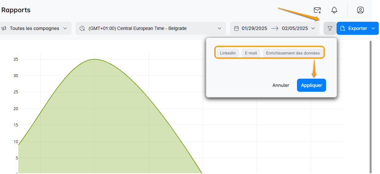 Vous pouvez accéder à la page de rapports d'une campagne particulière depuis votre page de liste de leads et appliquer des filtres spécifiques comme uniquement les données de LinkedIn ou e-mail, ou l'enrichissement de données.