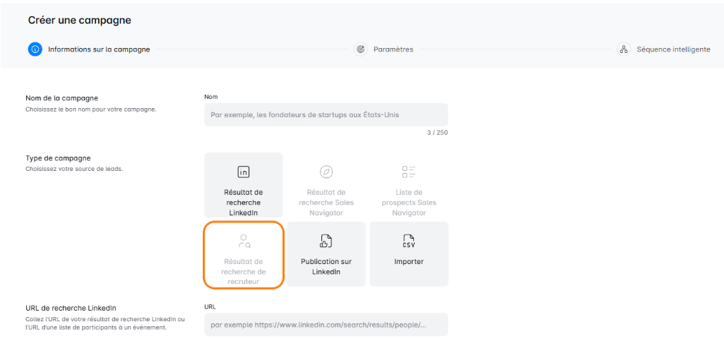 Maintenant, retournez à Leadriver et choisissez le type de campagne que vous souhaitez lancer. Donnez à votre campagne un nom accrocheur et facile à retenir. 📝 N'oubliez pas de vérifier l'option de connexion Network dans Leadriver également. Voici la partie amusante : collez l'URL de recherche LinkedIn dans le champ ‘Campaign URL’ dans Leadriver. C'est comme tracer votre chemin vers les candidats parfaits ! 🎯