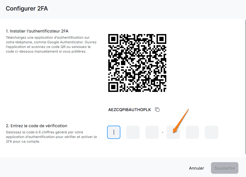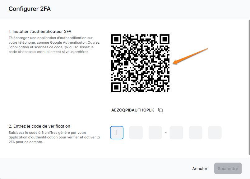 Scanner le code QR : Ouvrez l'application d'authentification et utilisez-la pour scanner le code QR affiché sur votre écran. Si vous ne pouvez pas scanner un code, voici un code que vous pouvez insérer dans votre application d'authentification.