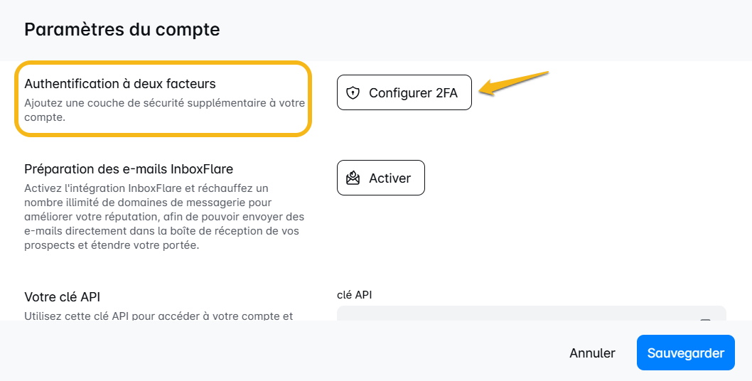 Trouvez l'option "Authentification à deux facteurs" et cliquez sur Configurer 2FA. -