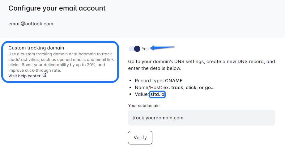 - Accédez au domaine de suivi personnalisé et activez-le. Copiez la valeur dans votre enregistrement CNAME dans vos paramètres DNS.