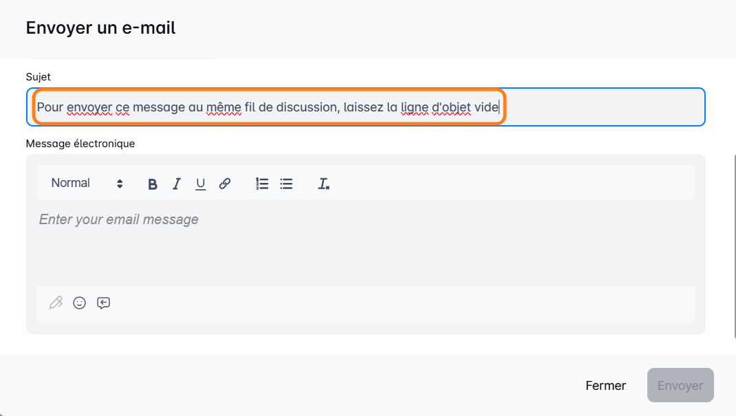 - Pour continuer un fil de discussion par e-mail après votre e-mail initial, il suffit de ne pas ajouter de ligne d'objet dans vos e-mails suivants. En laissant le champ de l'objet vide, Leadriver envoie intelligemment ces e-mails comme faisant partie du même fil. C'est aussi simple que ça !