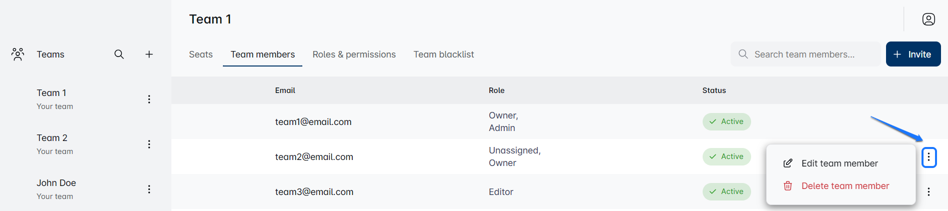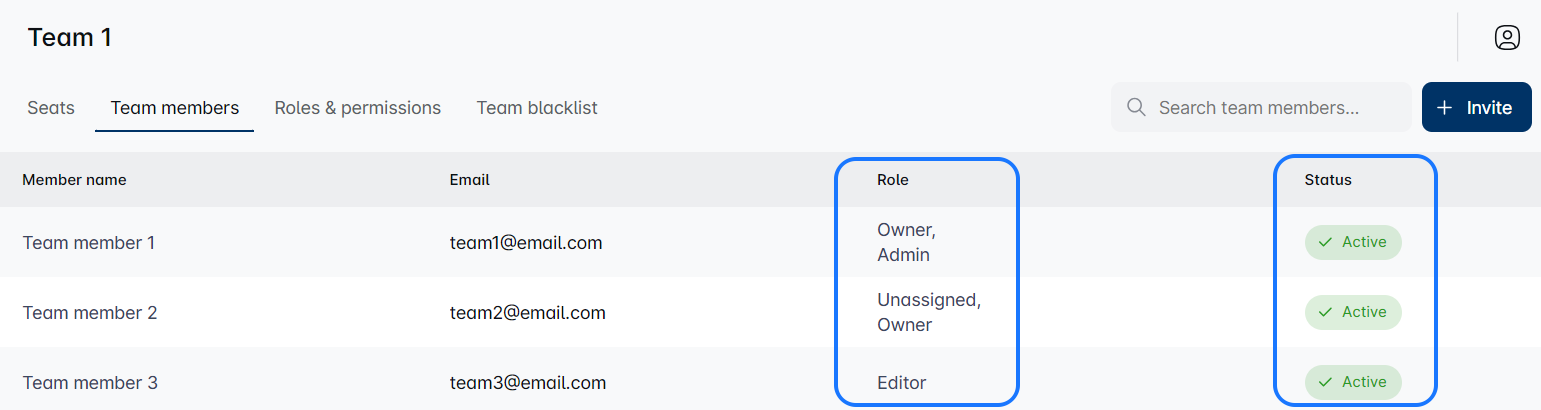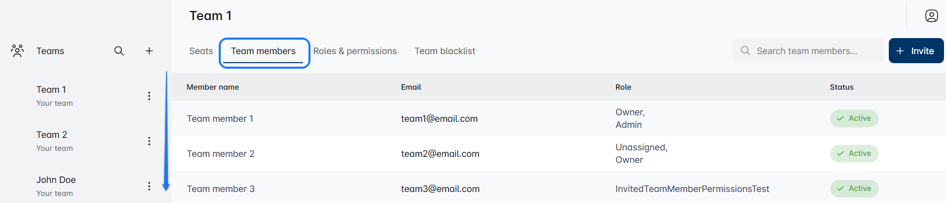 'टीम सदस्य' टैब पर क्लिक करें अपनी टीम की वर्तमान लाइनअप का अवलोकन करने के लिए जहां आप सभी की भूमिकाएं देख सकते हैं, नए सदस्यों को आमंत्रित कर सकते हैं, और अधिक।