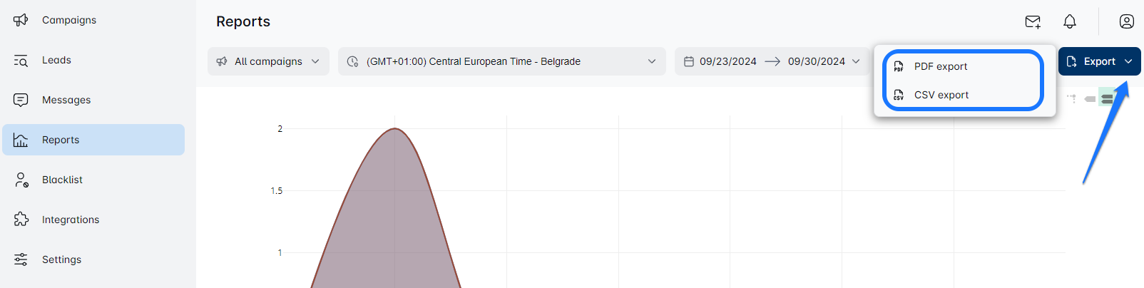Leadriver आसान डेटा निर्यात प्रदान करता है! तीन बिंदुओं के साथ प्रति अभियान निर्यात करें, या ईमेल के माध्यम से लीड्स अनुभाग से सभी अभियानों को निर्यात करें। PDF या CSV प्रारूप में फ़िल्टर किए गए निर्यात के लिए रिपोर्ट पृष्ठों का उपयोग करें, जो सूचनात्मक विश्लेषण को सक्षम बनाता है। क्या आप डेटा को अपनी सफलता का मार्गदर्शन करने के लिए तैयार हैं? 🌟🚀