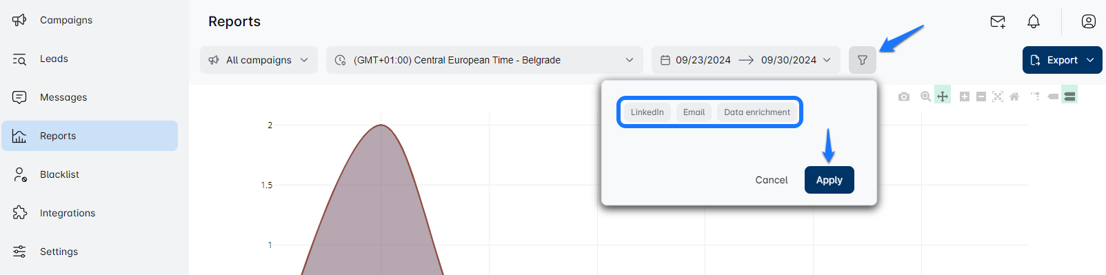 आप अपने लीड्स सूची पृष्ठ से किसी विशेष अभियान के रिपोर्ट पृष्ठ तक पहुँच सकते हैं और विशेष फ़िल्टर लागू कर सकते हैं जैसे केवल LinkedIn या ईमेल से डेटा, या डेटा संवर्धन।