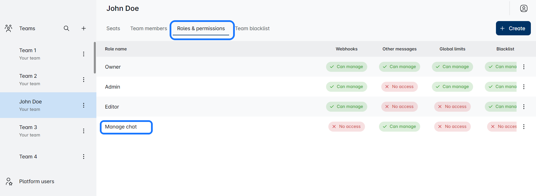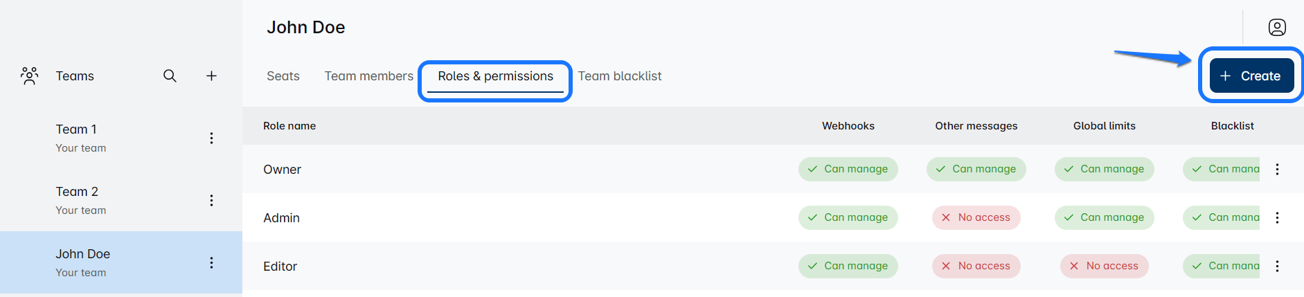 'Roles & Permissions' पर जाएं, 'Create' पर क्लिक करें, और अभियान प्रबंधन, संदेश प्रबंधन, या ब्लैकलिस्टिंग जैसी अनुमतियों का चयन करें। आप अवलोकनात्मक पहुंच के लिए भूमिकाओं को केवल देखने के लिए भी सेट कर सकते हैं। Custom Roles के साथ, आप सुनिश्चित कर सकते हैं कि प्रत्येक टीम सदस्य के पास सही उपकरण और पहुंच का स्तर है, जिससे दक्षता और संगठन में सुधार होता है। अपनी टीम की भूमिकाओं को अपनी सटीक विशिष्टताओं के अनुसार आकार देने की लचीलापन का आनंद लें!✈️🌟