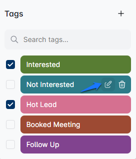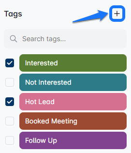 'लेबल्स' विकल्प पर क्लिक करें, और विभिन्न फ़िल्टर के साथ एक ड्रॉपडाउन मेनू पॉप अप होगा। 'Interested', 'Not Interested', 'Hot Lead', 'Booked Meeting', 'Follow Up', 'SPAM', और 'Wants to chat' जैसे पूर्वनिर्धारित लेबल्स में से चुनें।