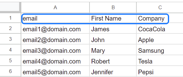 - CSV को अपने लीड स्रोत के रूप में उपयोग करके ईमेल भेजने के लिए, आपको एक आवश्यक कॉलम की आवश्यकता है: एक कॉलम जिसका नाम 'email' (छोटे अक्षरों में) हो।