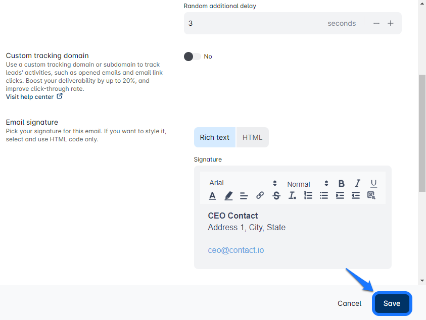 Di sini, Anda dapat mengubah nama pengirim, menyesuaikan pengaturan kampanye, mengatur domain pelacakan khusus, memperbarui tanda tangan Anda, dan bahkan menambahkan penerima BCC. 🖊️