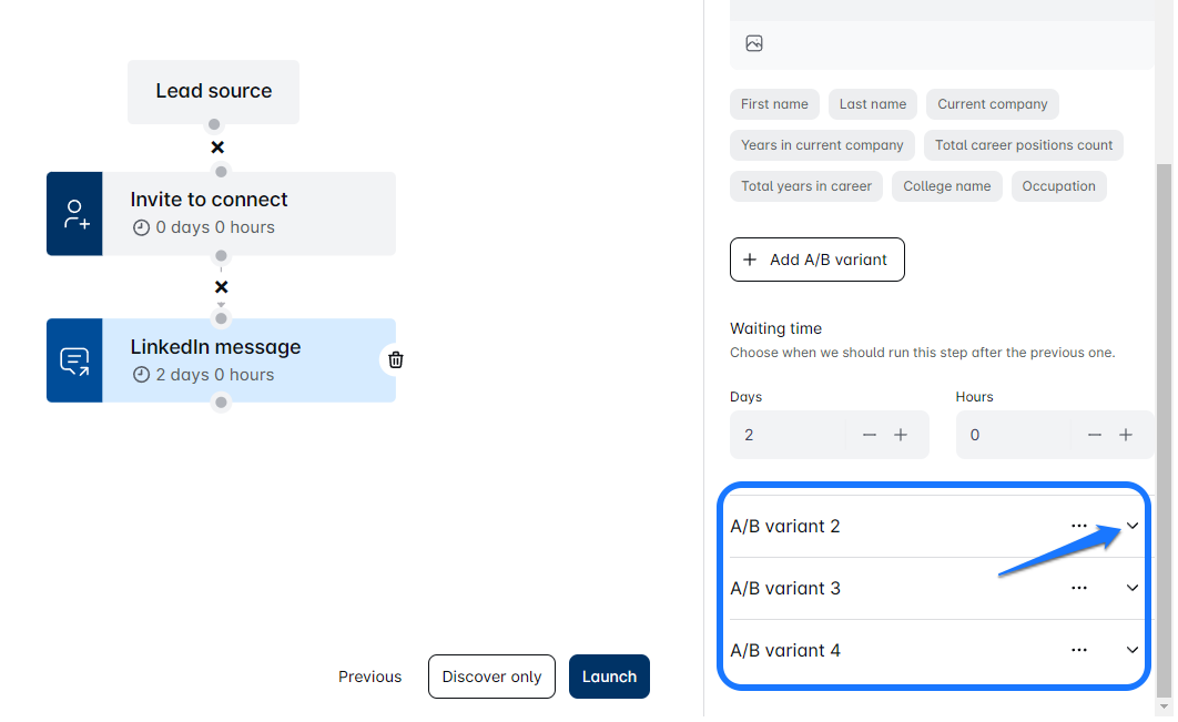 - Di Leadriver, Anda dapat menguji berbagai bagian dari salinan pesan Anda, seperti pesan LinkedIn, Email, InMail, Undangan untuk Terhubung, atau bahkan waktu antara langkah-langkah selama proses pembuatan urutan kampanye. Anda dapat membuat hingga 5 varian uji yang berbeda!
